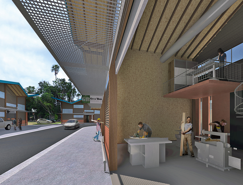 - un pôle technique extérieur, léger et couvert : mise à disposition de machines spécifiques au travail du bois et de la construction dans un hall commun, d’un espace de stockage, d’un séchoir, d’un tunnel de traitement, d’une cabine à vernir…